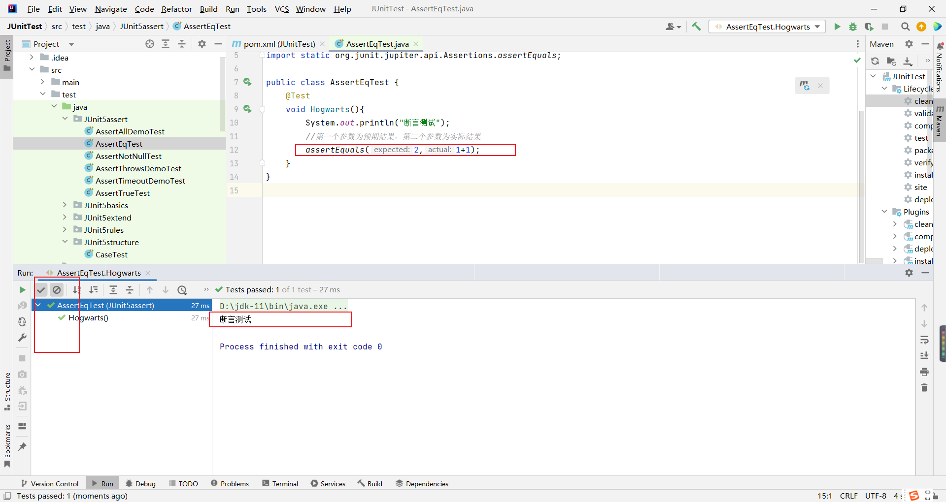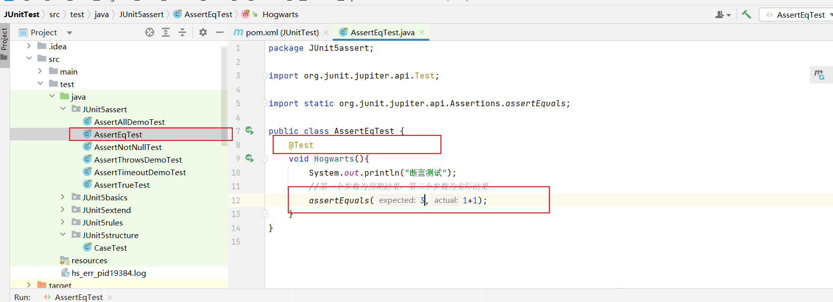 assertEquals,方法前记得添加Test注释package JUnit5assert; import org.junit.jupiter.api.Test; import static org.junit.jupiter.api.Assertions.assertEquals; public class AssertEqTest { @Test void Hogwarts(){ System.out.println("断言测试"); //第一个参数为预期结果,第二个参数为实际结果 assertEquals(3,1+1); } }