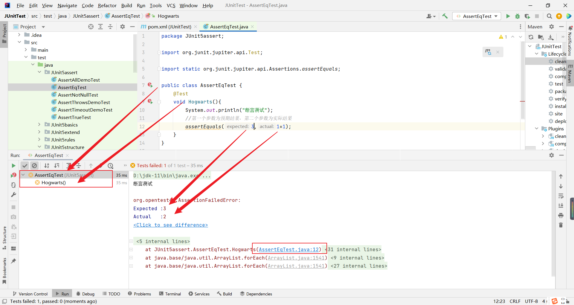 - 已知 1+1!=1,断言应该是失败的,我们执行查看结果 - 断言失败 预期结果与实际结果不等 错误输出信息中可以看到断言所在的行数以及测试类和测试方法 还有具体的测试信息