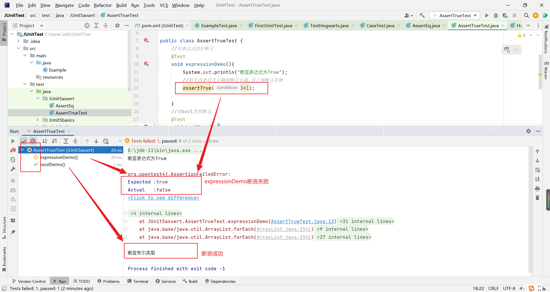 expressionDemo方法中断言 3<1 是错误的表达式,断言应失败,boolDemo方法中直接断言true,断言正确。