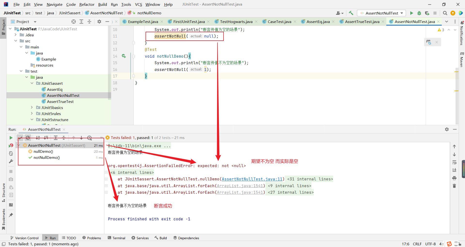 nullDemo方法中 断言null而我们期望得到到不为空 不符合预期 断言失败notNullDemo方法中 断言 1 不为空 断言成功