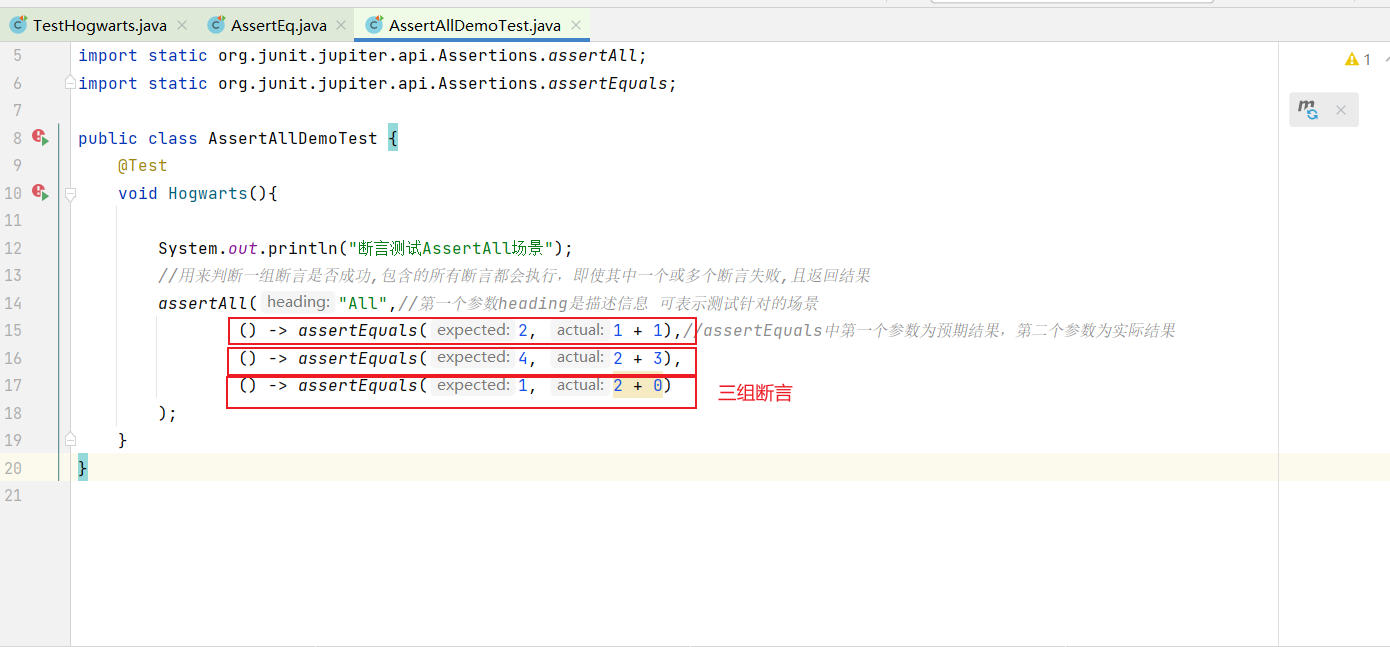 assertAll("All",//描述信息 () -> assertEquals(2, 1 + 1),//使用assertEquals断言方式进行断言,也可使用其他方式 () -> assertEquals(4, 2 + 3) );