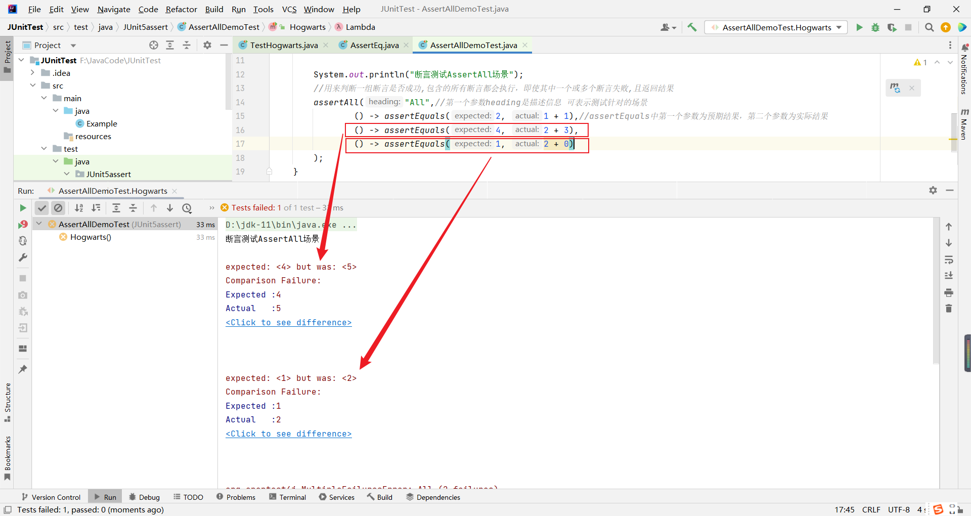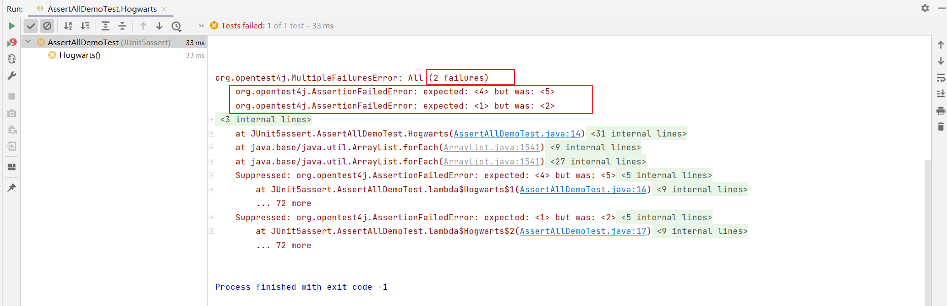 package JUnit5assert; import org.junit.jupiter.api.Test; import static org.junit.jupiter.api.Assertions.assertAll; import static org.junit.jupiter.api.Assertions.assertEquals; public class AssertAllDemoTest { @Test void Hogwarts(){ System.out.println("断言测试AssertAll场景"); //用来判断一组断言是否成功,包含的所有断言都会执行,即使其中一个或多个断言失败,且返回结果 assertAll("All",//第一个参数heading是描述信息 可表示测试针对的场景 () -> assertEquals(2, 1 + 1),//assertEquals中第一个参数为预期结果,第二个参数为实际结果 () -> assertEquals(4, 2 + 3), () -> assertEquals(1, 2 + 0) ); } } - 显示两组失败信息,分别对应方法中的两组预期值和实际值不相等的断言