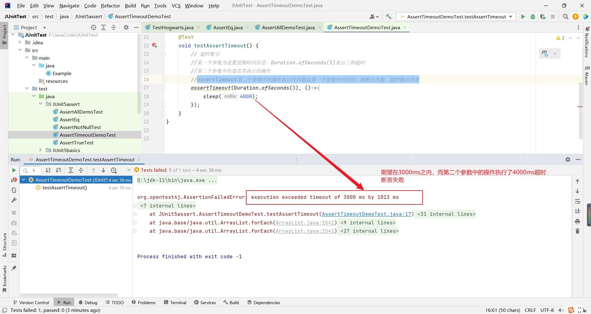 assertTimeout(Duration.ofSeconds(3), ()->{ sleep(4000); });- assertTimeout 第二个参数中的操作执行时间超过第一个参数中的时间,则断言失败,超时抛出异常