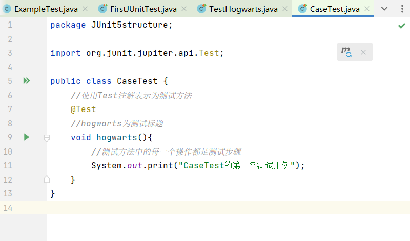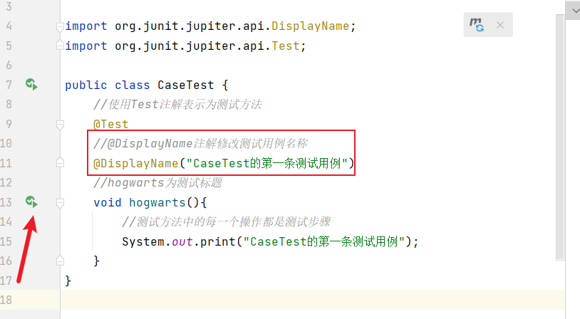 - 在类中编写测试方法 在方法左侧出现可执行的标志代表识别成功
