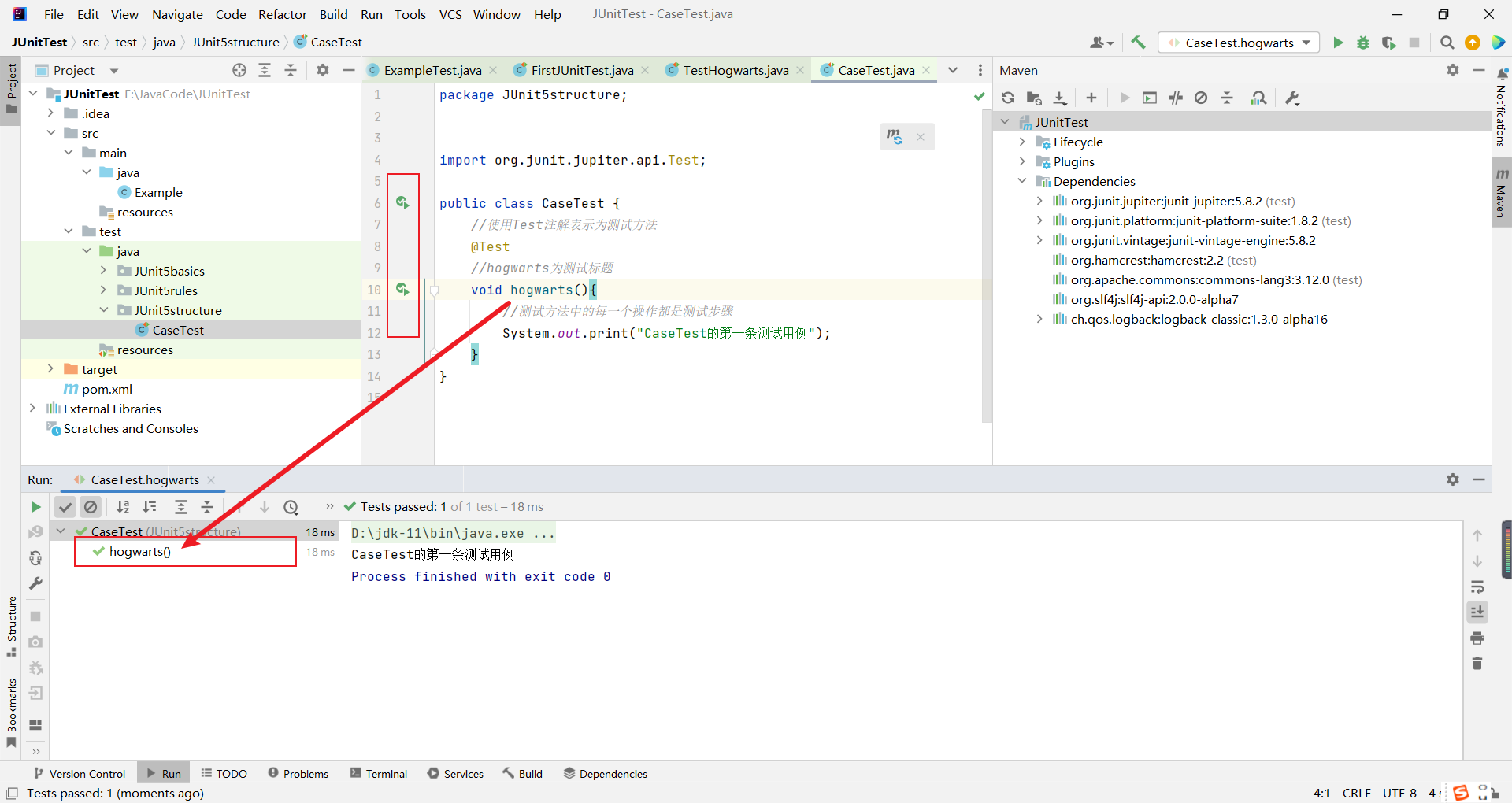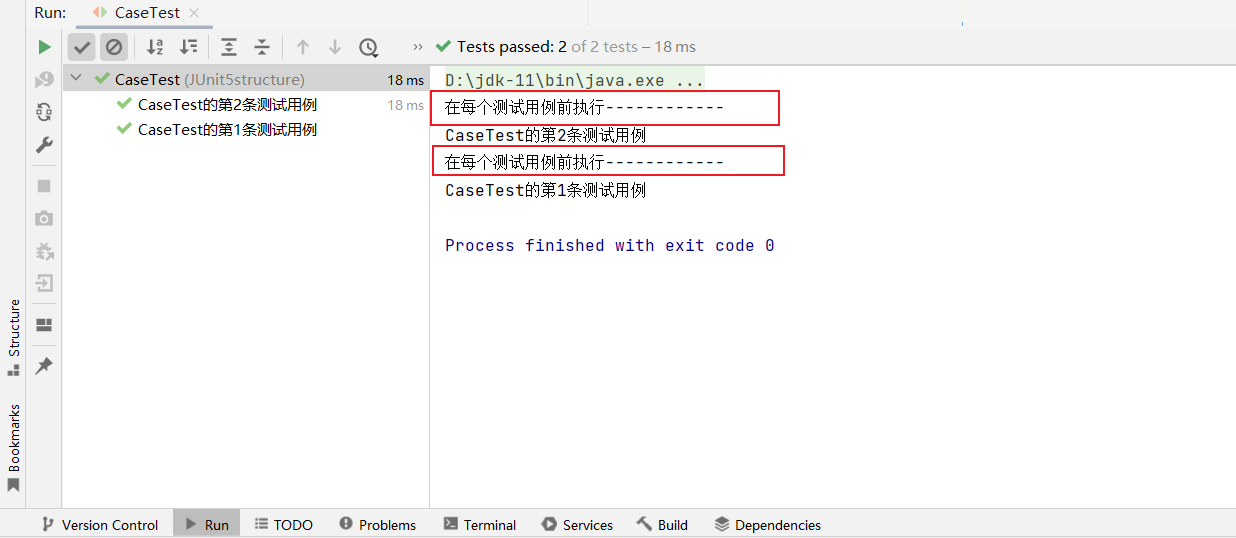 package JUnit5structure; import org.junit.jupiter.api.BeforeEach; import org.junit.jupiter.api.DisplayName; import org.junit.jupiter.api.Test; import static org.junit.jupiter.api.Assertions.assertEquals; public class CaseTest { @BeforeEach void setup(){ System.out.println("在每个测试用例前执行------------"); } //使用Test注解表示为测试方法 @Test //@DisplayName注解修改测试用例名称 @DisplayName("CaseTest的第1条测试用例") //hogwarts为测试标题 void hogwarts(){ //测试方法中的每一个操作都是测试步骤 System.out.println("CaseTest的第1条测试用例"); //测试用例中的断言信息,第一个值为预期结果,第二个值为实际结果 assertEquals(2, 1 + 1); } @Test //@DisplayName注解修改测试用例名称 @DisplayName("CaseTest的第2条测试用例") //hogwarts为测试标题 void secondhogwarts(){ //测试方法中的每一个操作都是测试步骤1 System.out.println("CaseTest的第2条测试用例"); //测试用例中的断言信息,第一个值为预期结果,第二个值为实际结果 assertEquals(2, 1 + 1); } }- 运行查看执行结果