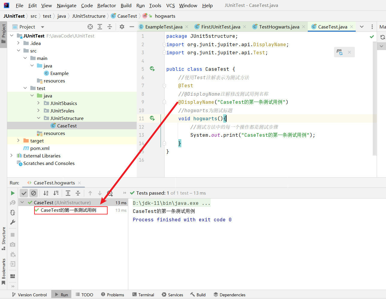 - 在测试函数上方添加@DisplayName 注解,再次执行查看结果。