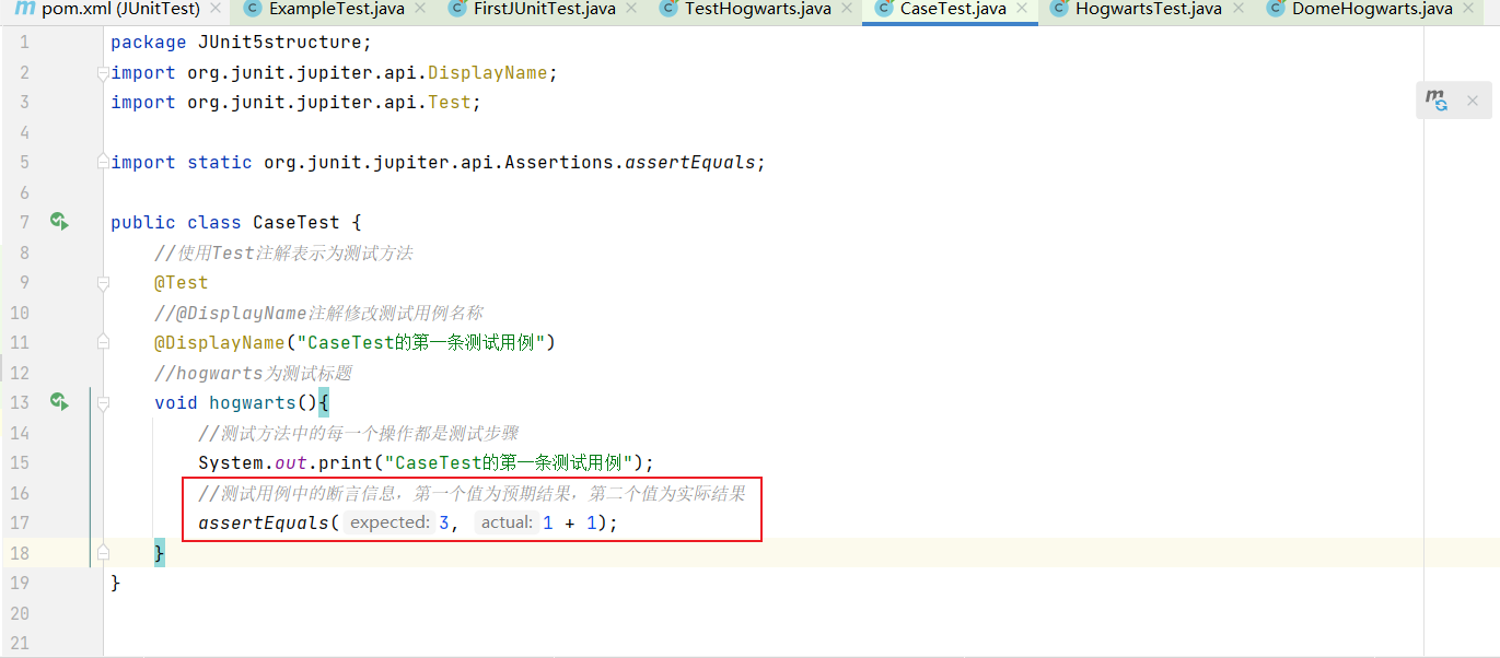 package JUnit5structure; import org.junit.jupiter.api.AfterEach; import org.junit.jupiter.api.BeforeEach; import org.junit.jupiter.api.DisplayName; import org.junit.jupiter.api.Test; import static org.junit.jupiter.api.Assertions.assertEquals; public class CaseTest { @BeforeEach void setup(){ System.out.println("在每个测试用例前执行------------"); } @AfterEach void teardown(){ System.out.println("在每个用例后都会执行============="); } //使用Test注解表示为测试方法 @Test //@DisplayName注解修改测试用例名称 @DisplayName("CaseTest的第1条测试用例") //hogwarts为测试标题 void hogwarts(){ //测试方法中的每一个操作都是测试步骤 System.out.println("CaseTest的第1条测试用例"); //测试用例中的断言信息,第一个值为预期结果,第二个值为实际结果 assertEquals(2, 1 + 1); } @Test //@DisplayName注解修改测试用例名称 @DisplayName("CaseTest的第2条测试用例") //hogwarts为测试标题 void secondhogwarts(){ //测试方法中的每一个操作都是测试步骤1 System.out.println("CaseTest的第2条测试用例"); //测试用例中的断言信息,第一个值为预期结果,第二个值为实际结果 assertEquals(2, 1 + 1); } }