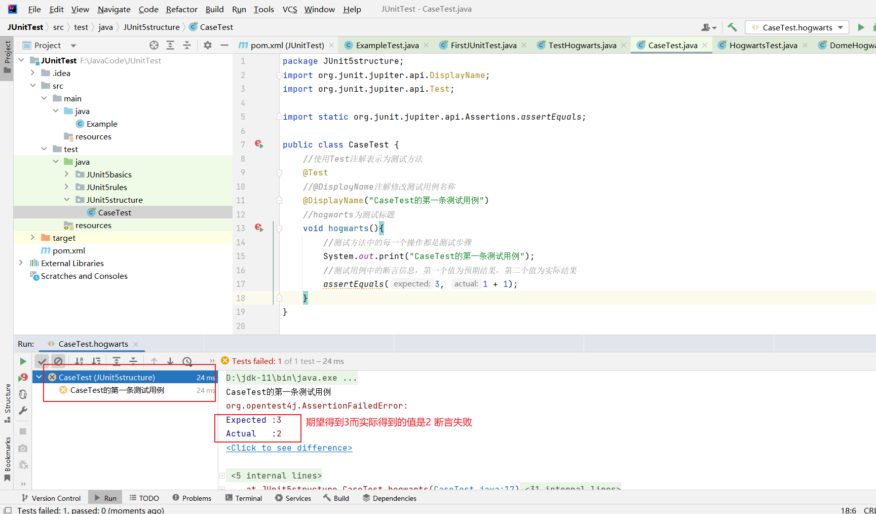 - 执行查看结果 断言失败 因为 1+1!=3 预期结果不能与实际结果 断言失败 测试用例不通过