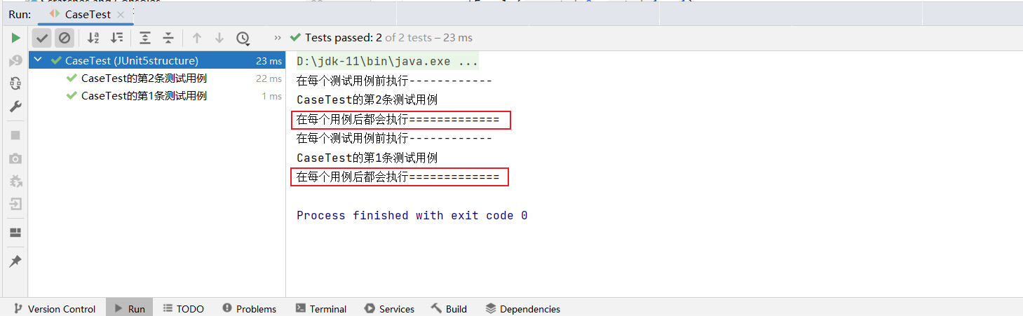 @AfterEach void teardown(){ System.out.println("在每个用例后都会执行============="); }- 执行查看结果,可以看到 teardown 方法中的操作在每条测试用例执行后执行了。