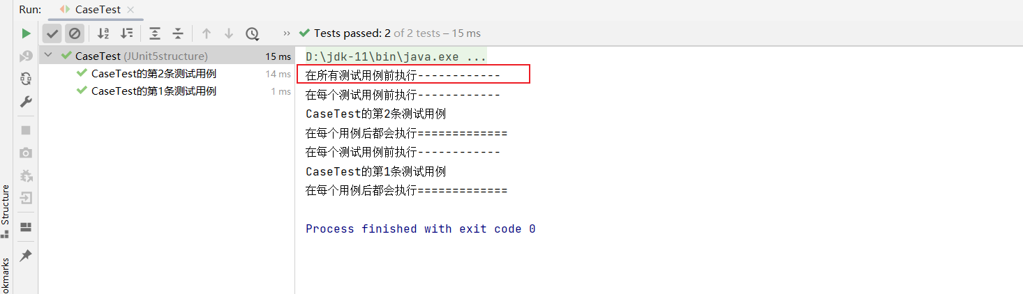 @BeforeAll static void setupAll(){ System.out.println("在所有测试用例前执行------------"); }- 执行测试类查看结果,可以看到 setupAll 方法中的内容只打印了一次,也就是在执行类最初被调用了一次。