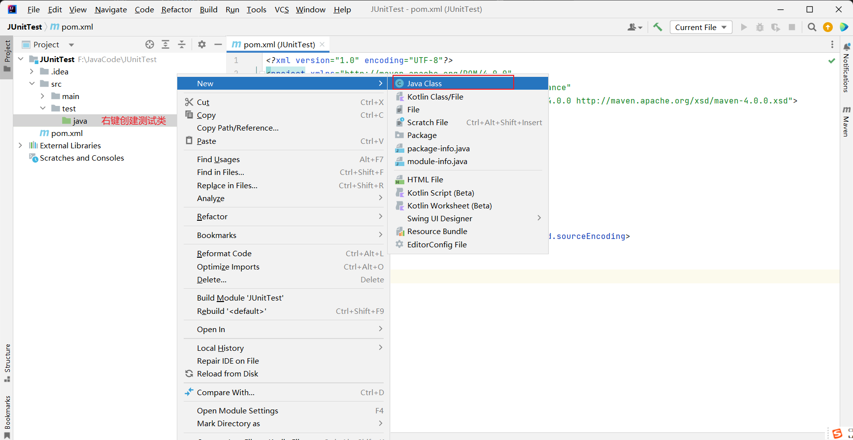- 在 src->test->java 右键创建测试类