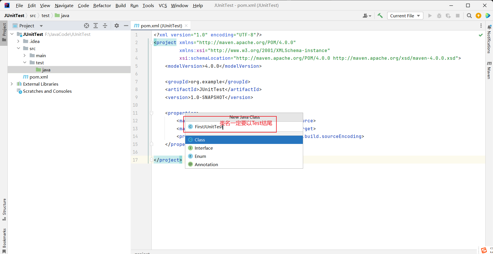 JUnit Platform、JUnit Jupiter和JUnit Vintage。 - 创建测试类时要保证测试类以
