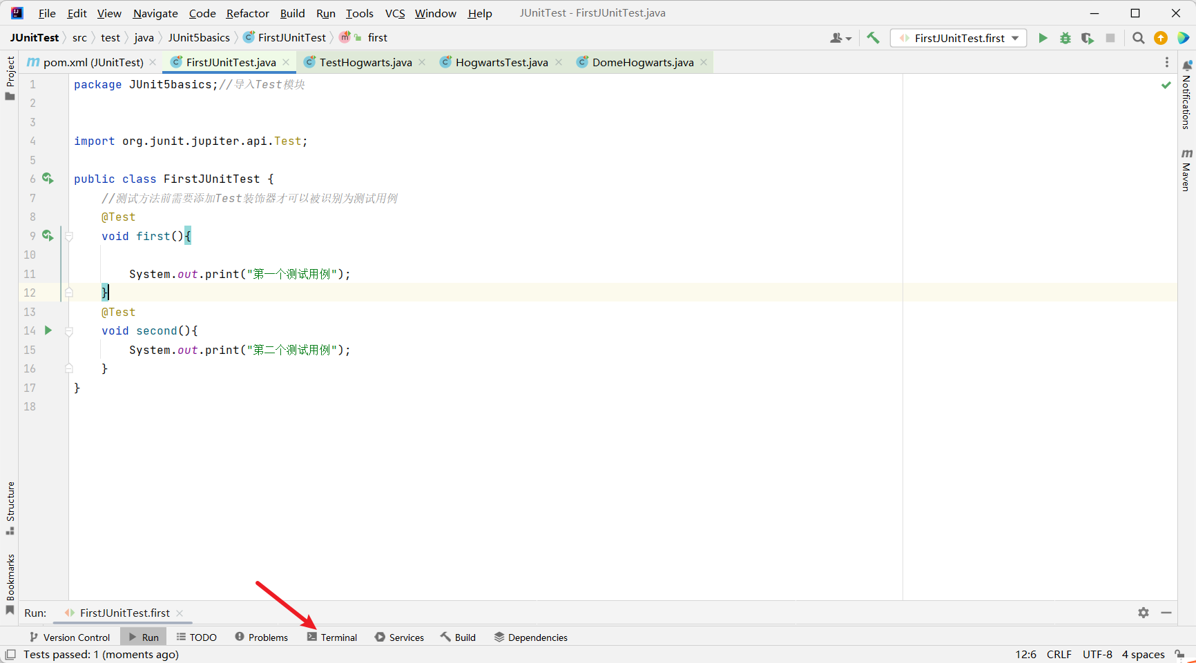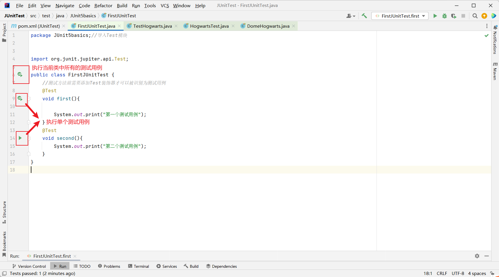 - 单一方法右侧的运行键是运行单个测试用例