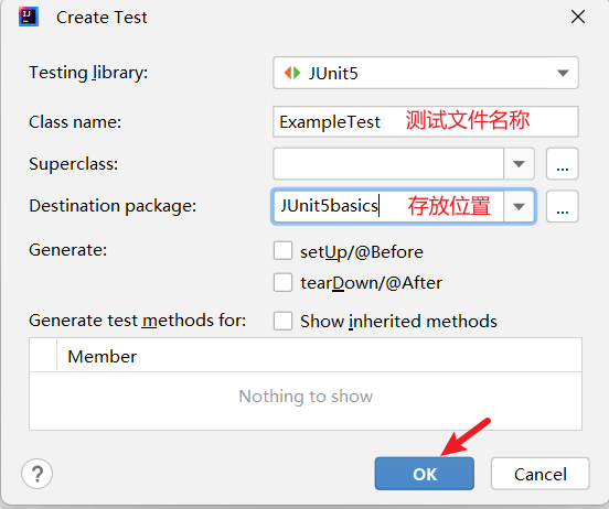 - Class name 为测试类名称 默认为业务类名+Test(如果修改过命名规则需要自行修改为符合命名规范);Destination package 输入存放的位置;填写完毕后点击 OK 生成测试类
