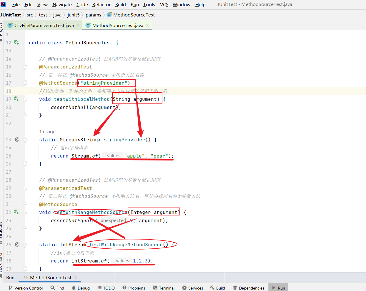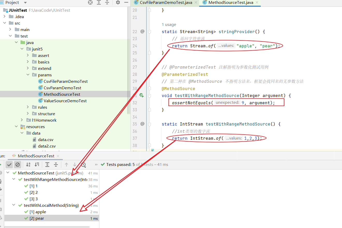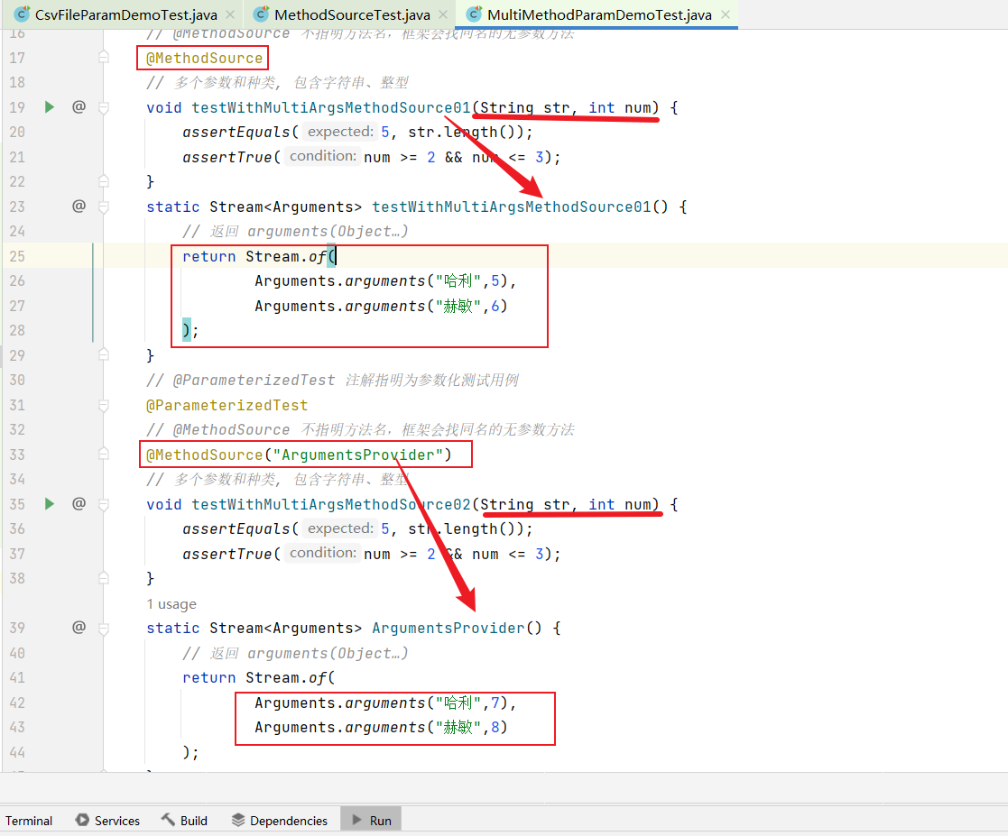 - 如果在 @MethodSource 注解中未指明方法名,会自动调用与测试方法同名的静态方法