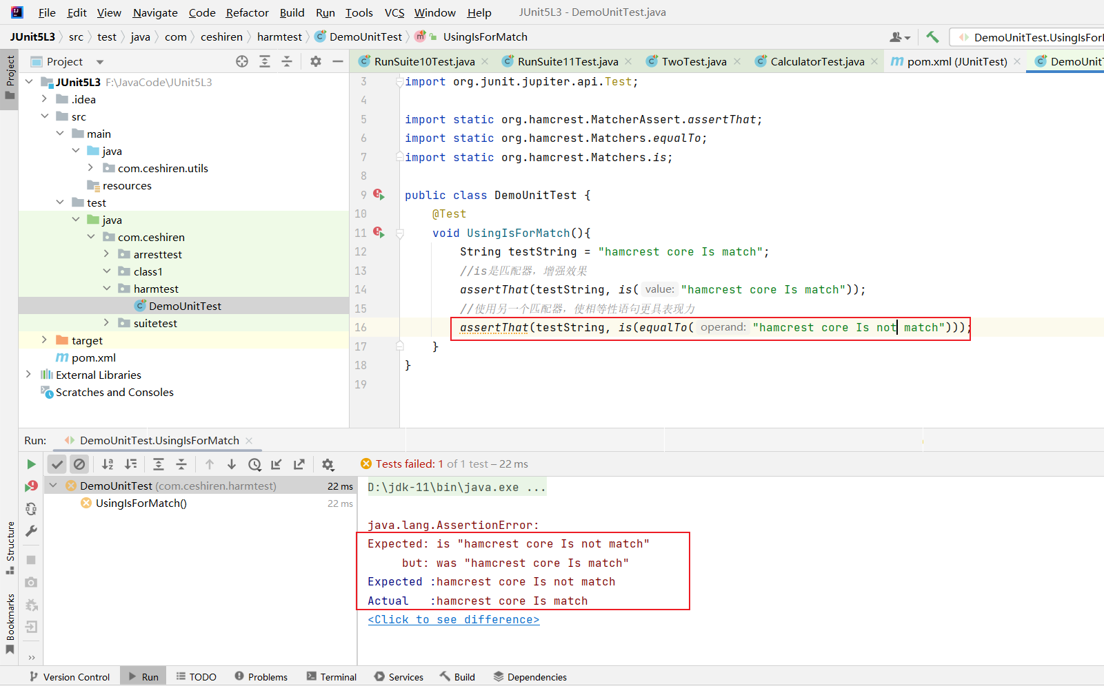 assertThat(testString, is(equalTo("hamcrest core Is not match")));