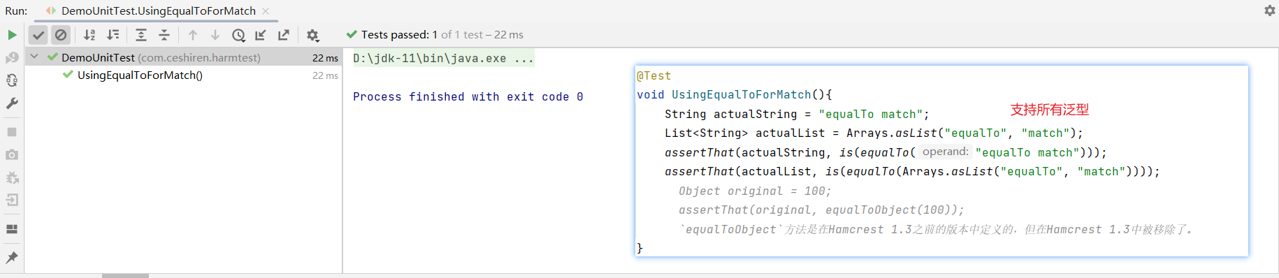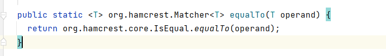 is(Matcher<T>)一起使用{style=width:500px} ctrl+鼠标点击equalTo可以查看对于 equalTo 的定义,从定义可以看出 equalTo 可以接收所有的泛型。