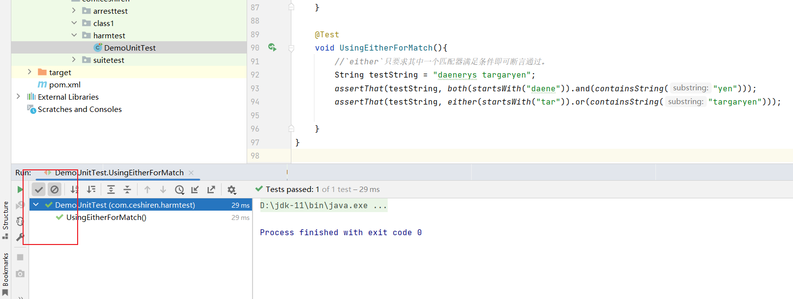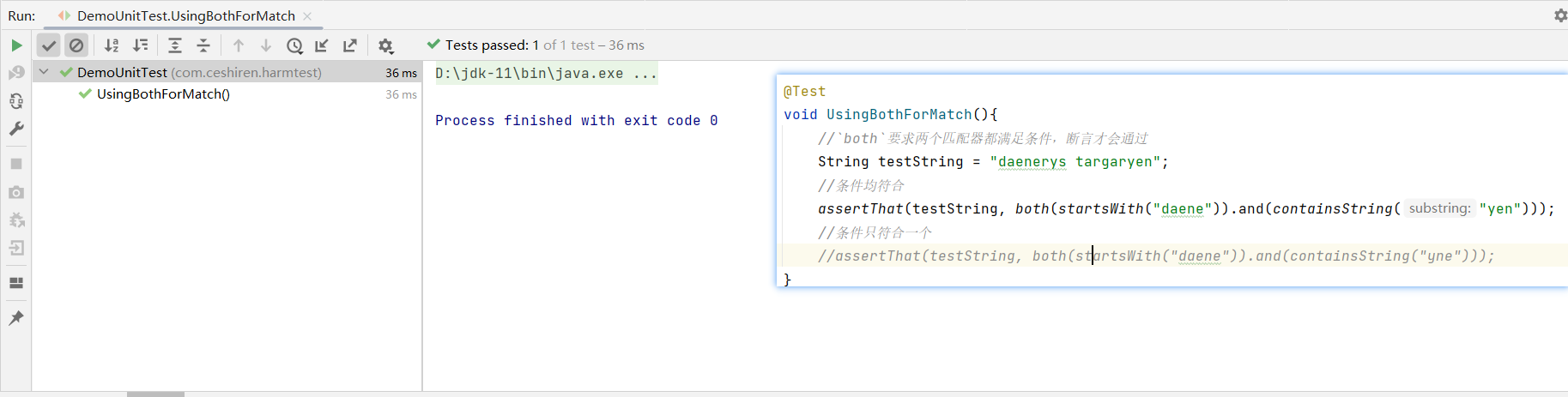 testString字符串中是以daene开头也包含yen,both 匹配器的条件都满足;使用并非是以tar开头,但包含targaryen,符合 either 匹配器中的条件之一,两条断言均通过。